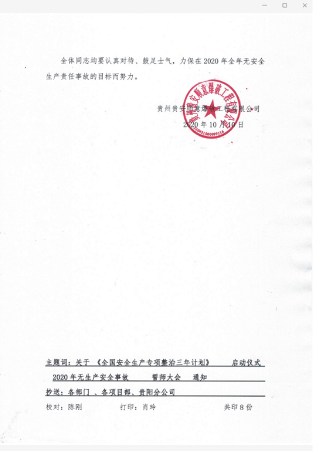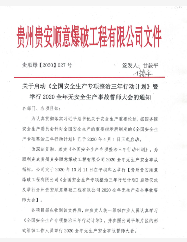 (公司平坝片区人员、台泥白山项目部负责人丁权鸿、清镇项目部刘星等都以饱满的热情参加此次大会) (办公室主任陈刚宣读贵顺爆2020.027号文) 贵州贵安顺意爆破工程有限公司贵顺爆2020.027号文